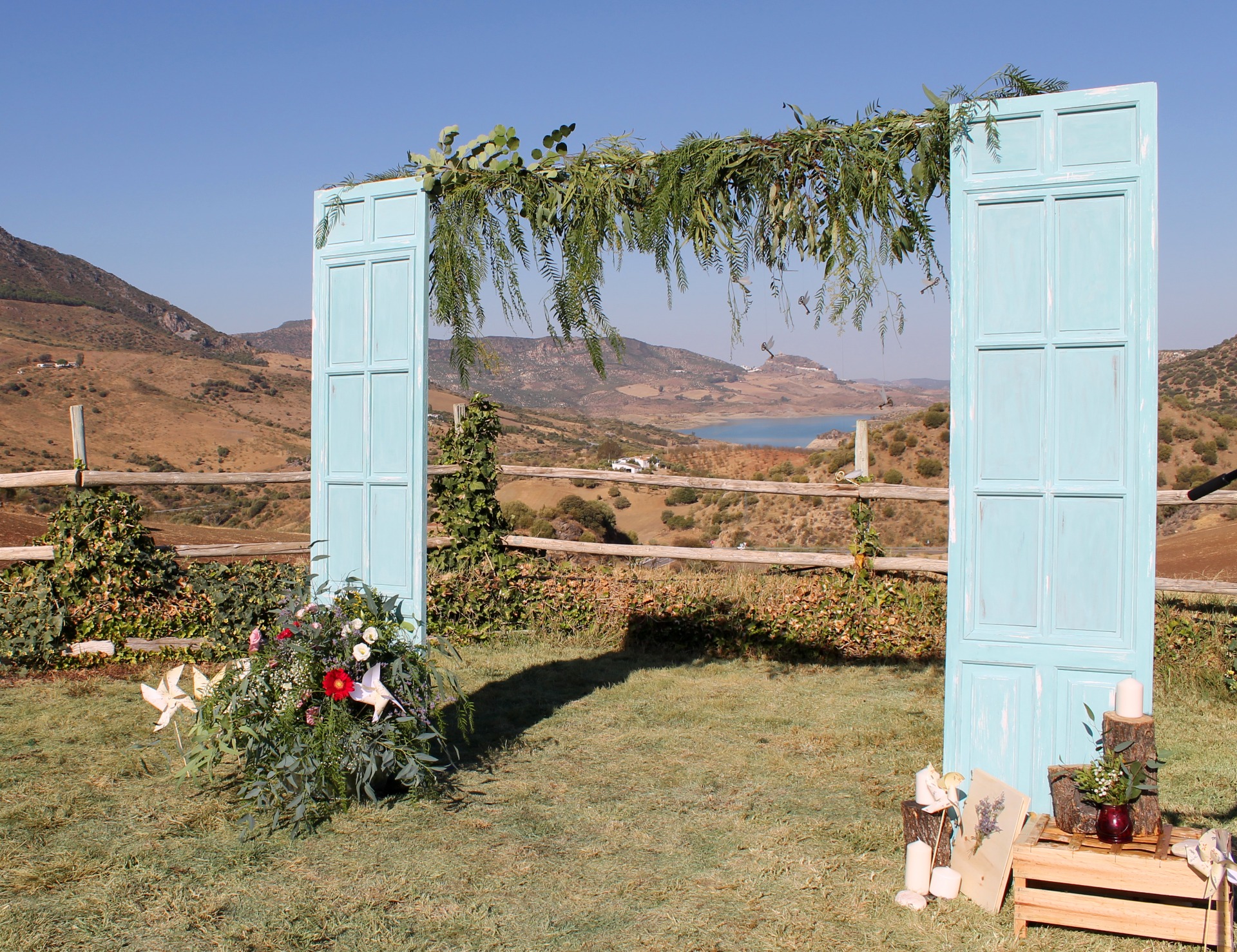 En octubre de 2017 y en un entorno de ensueño tuvo lugar la boda de Sandra y Fran. Esta encantadora pareja nos concedió la oportunidad de trabajar en la decoración y el oficio de su ceremonia, cuya disposición organizamos en torno a la espectacular panorámica de la Sierra de Grazalema, que decidimos enmarcar por medio de un altar de puertas azules, schinus molle, eucaliptus y gerberas. Asimismo, además de los tonos verdes, turquesas y carmesíes, no podían faltar las libélulas, los elementos naturales y las reminiscencias al viento en esta celebración con música en directo y espontaneidad, cuyo oficio fue todo un reto para nosotros, acercando el guion a su versión más teatral. Y es que Sandra es parte indispensable de Aderezo y de nuestras vidas, y participar en su día especial fue todo un regalo.