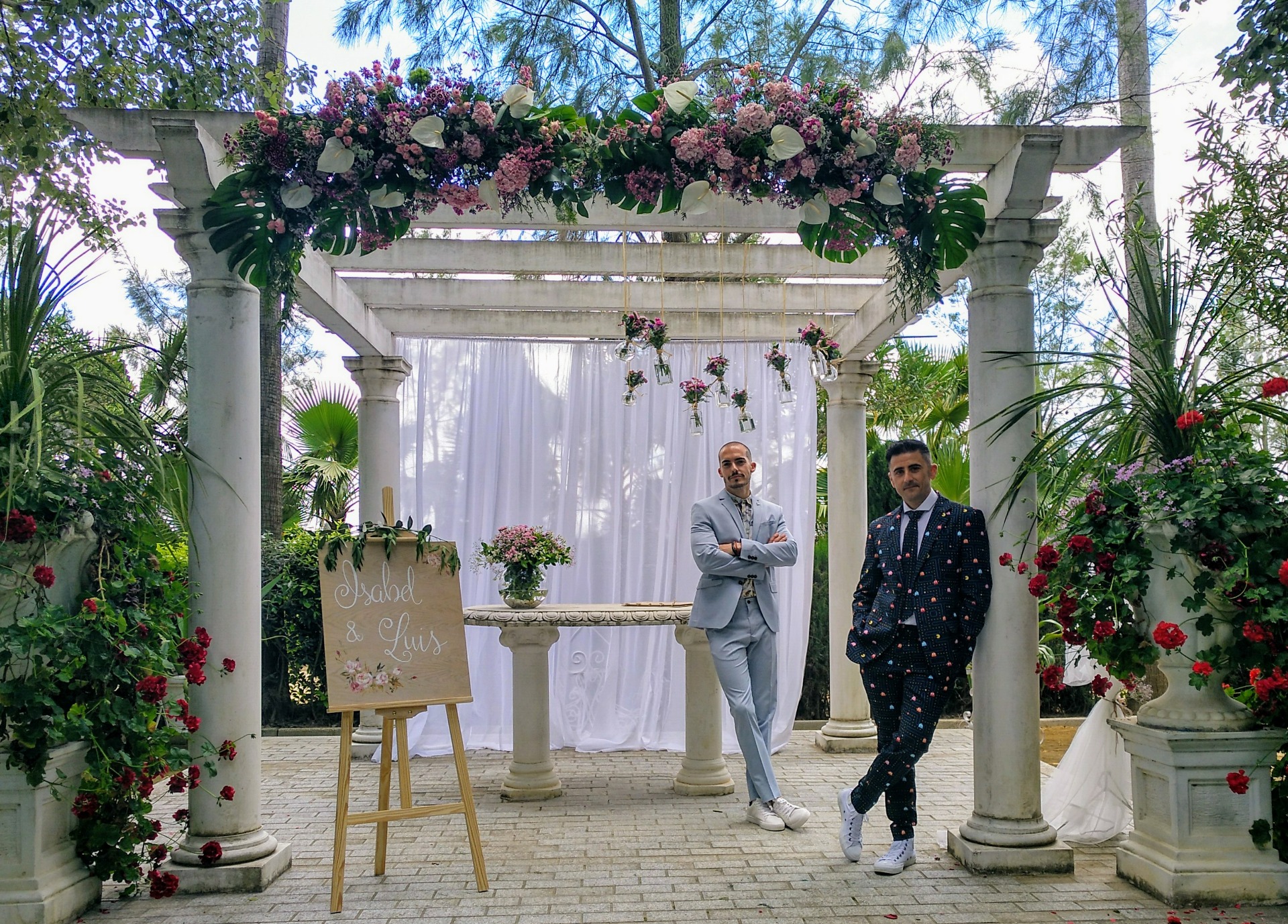 En un jardín rebosante de vida en plena primavera sevillana tuvimos el placer de organizar la decoración y el oficio de la boda de Isabel y Luis, a quienes nos unen unos lazos muy especiales, más aún después de aquel bonito día. La elegancia de las flores y los materiales nobles fueron el hilo conductor de la decoración, para la que contamos con la participación indispensable de nuestro Fran. Entre los espacios propuestos, el seating plan y el photocall, realizados en base a antiguas puertas de madera, alpacas, cortinas y unos pequeños marcos de color blanco y papel granulado. Pero sin duda la tarea que más disfrutamos fue realizar la pintura que presidió la ceremonia, junto al atril desde el que disfrutamos como niños contemplando las caras de felicidad de cada uno de los invitados.