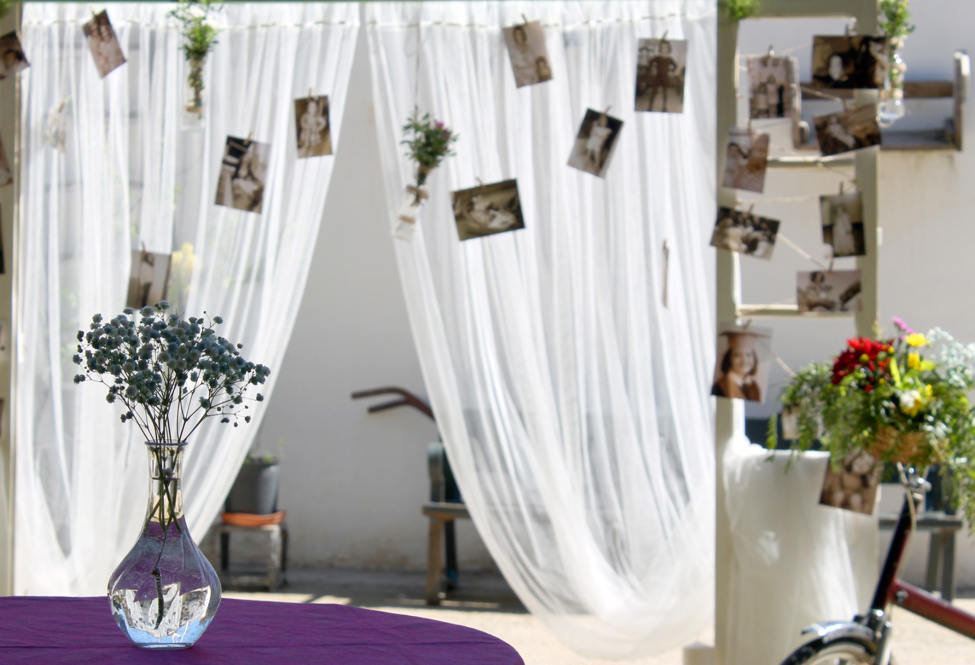 A partir de ahí nos pusimos a trabajar para hacer que la antigua fábrica de jabones que sería el escenario de este acontecimiento luciera como nunca antes, dividiendo la zona en tres espacios y llenando de flores, maderas, tul y fotografías cada rincón del tradicional patio encalado, impregnando de la sensibilidad de María todo detalle y haciendo que tanto adultos como niños pudiesen disfrutar de este evento inolvidable para la pequeña.
